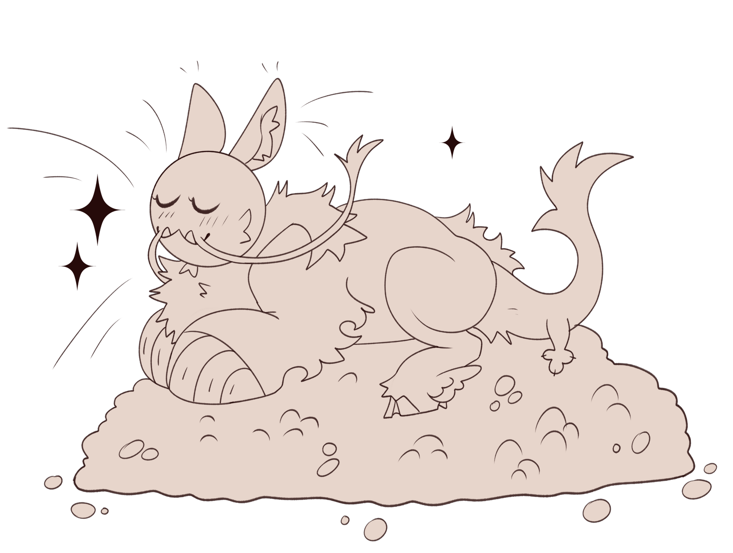 They tend to be very playful and full of energy, the Rocks are often hyperactive. They live almost exclusively in groups it's very unlikely for them to live alone. We generally found them in arid and deserts biomes, specifically in the Whispering Canyon, where their main villages and galleries are located. Rock cannot really be observed on the surface since they live underground. They dig large galleries with rooms connected by corridors. They dig in the ground and the sand with their front legs, then pushing the material to the outside thanks to the legs present on their tail. In these corridors, they move while rolling, forming a ball with their body. Their diet consists of meat only.